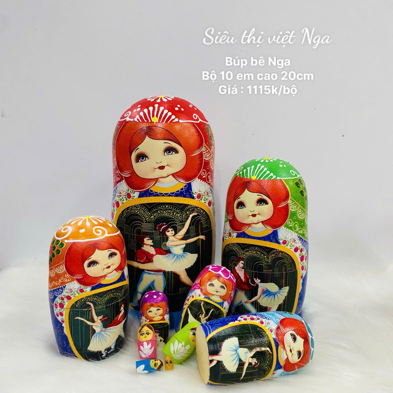 Bộ Matryoshka 10 em cao 20cm này không chỉ là một kiệt tác gỗ sơn mài, mà còn là bản giao hưởng ballet thu nhỏ – nơi nghệ thuật Nga hòa quyện với tình yêu gia đình, tạo nên một tuyệt tác đầy mê hoặc!