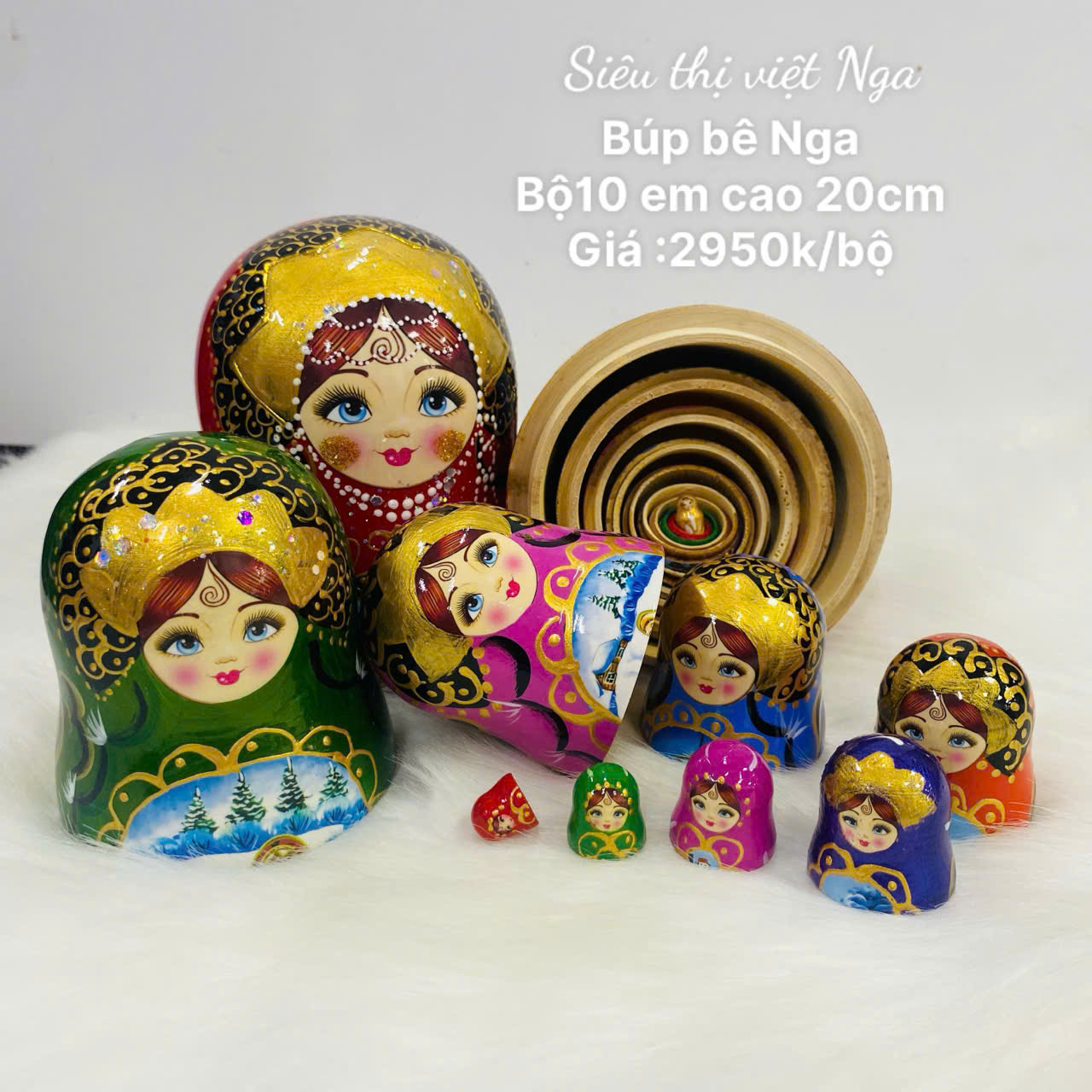 Bộ búp bê gỗ trong ảnh vẫn là búp bê Matryoshka (búp bê Nga lồng nhau) cổ điển, bộ 10 con cao nhất khoảng 20cm, với thiết kế cao cấp (giá cao hơn các bộ trước cho thấy tay nghề vẽ tinh xảo).