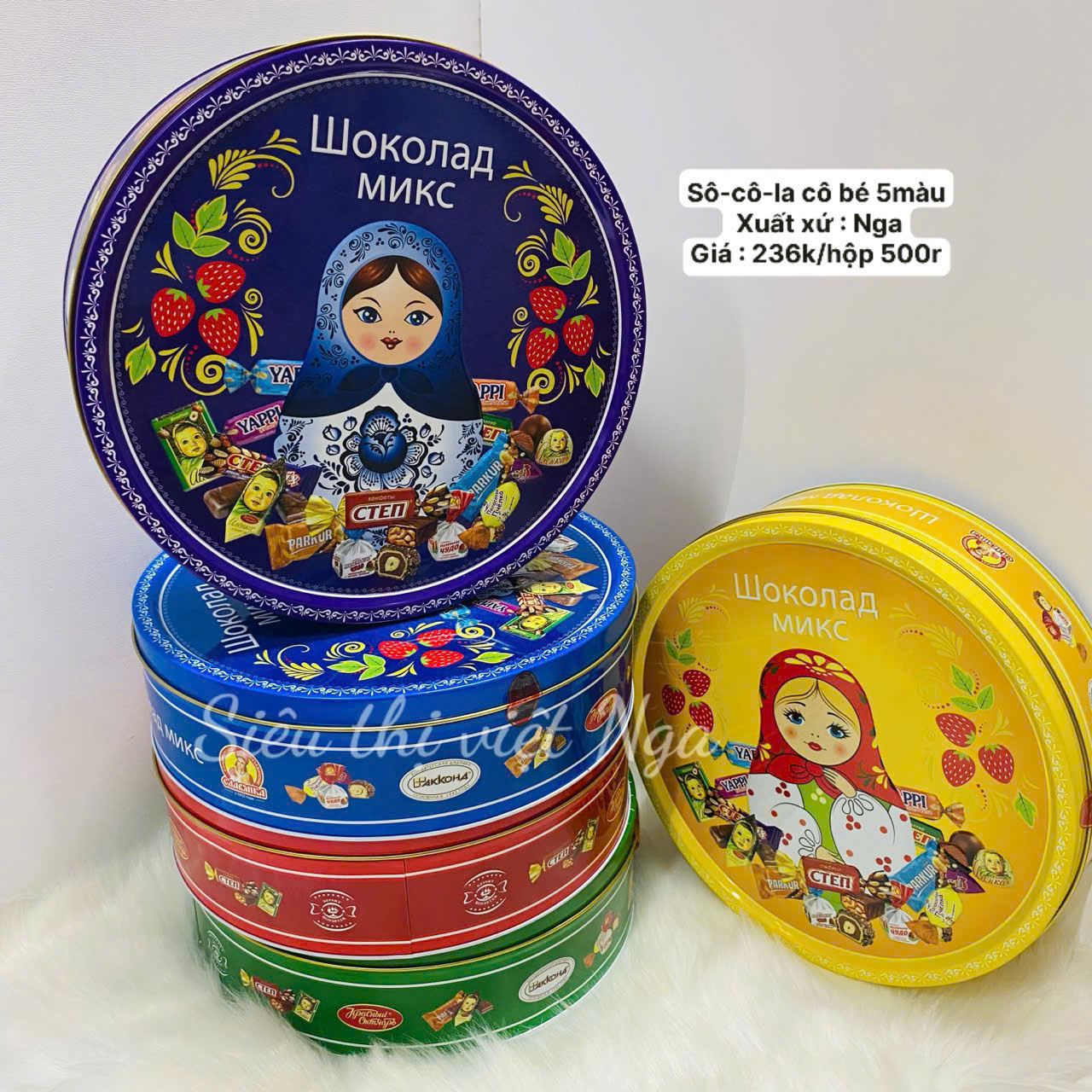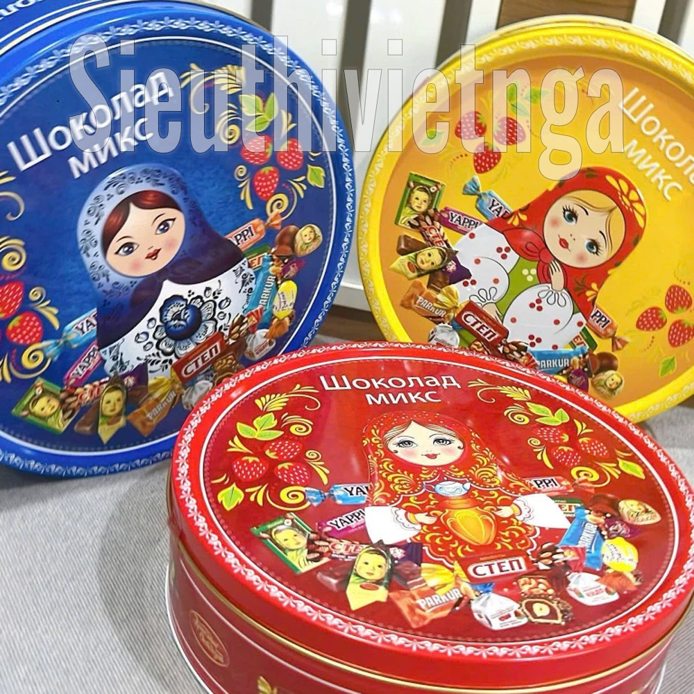 🍫 MÓN QUÀ HOÀN HẢO TỪ XỨ SỞ BẠCH DƯƠNG – KẸO SOCOLA HỖN HỢP NGA HỘP THIẾC BÚP BÊ MATRYOSHKA 5 MÀU! 🎁