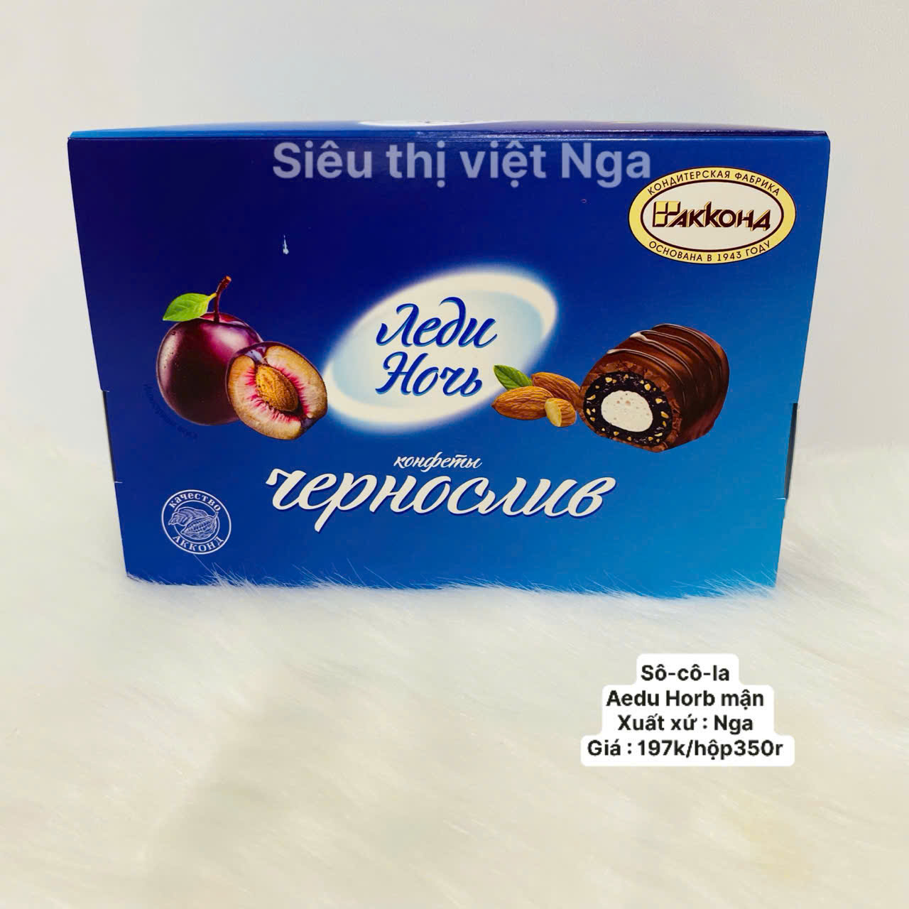 Kẹo socola Ledi Noch nhân mận do AKKOND – thương hiệu bánh kẹo có lịch sử hơn 80 năm – sản xuất. Sản phẩm có lớp vỏ socola mịn, bên trong là nhân kem béo kết hợp mận khô xay nhuyễn, mang đến vị chua ngọt hài hòa và hương trái cây tự nhiên đặc trưng. Kẹo socola Ledi Noch nhân mận thích hợp để thưởng trà, tiếp khách hoặc làm món quà tinh tế dành tặng người thân và bạn bè.