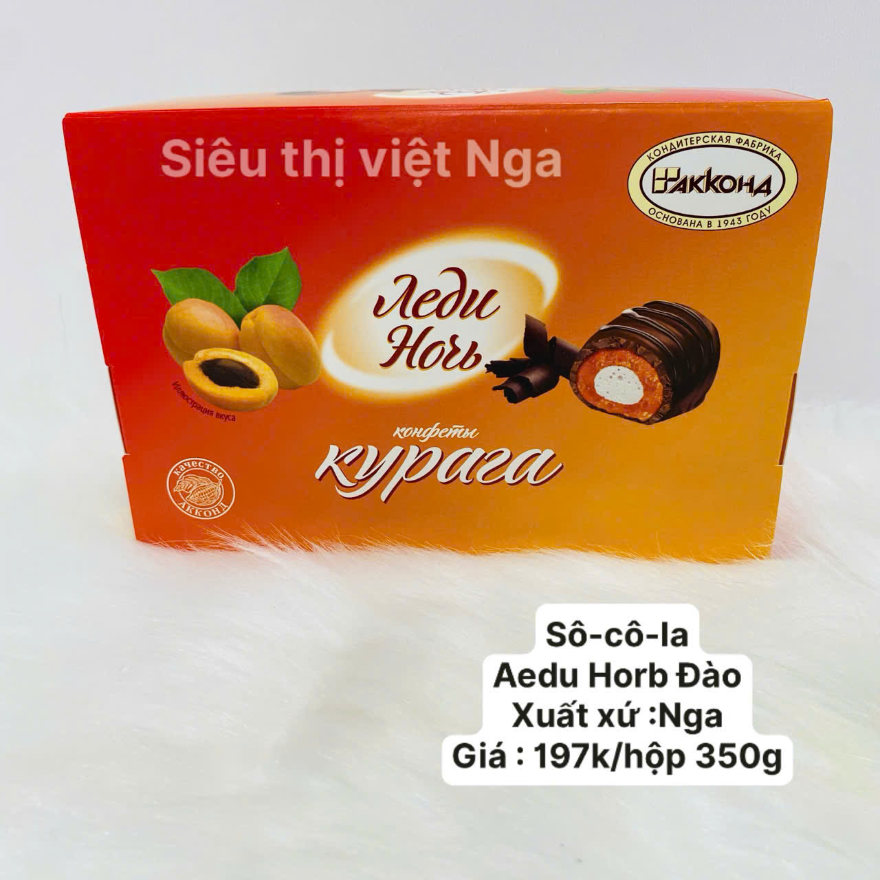 Kẹo socola Ledi Noch nhân mơ do AKKOND – thương hiệu bánh kẹo có lịch sử hơn 80 năm – sản xuất. Sản phẩm có lớp vỏ socola mịn bóng, bao bọc nhân kem mịn kết hợp mơ khô xay nhuyễn, tạo nên vị chua ngọt hài hòa và hương thơm trái cây tự nhiên. Kẹo socola Ledi Noch nhân mơ là lựa chọn lý tưởng để thưởng trà, tiếp khách hoặc làm món quà sang trọng gửi trao người thân, bạn bè.