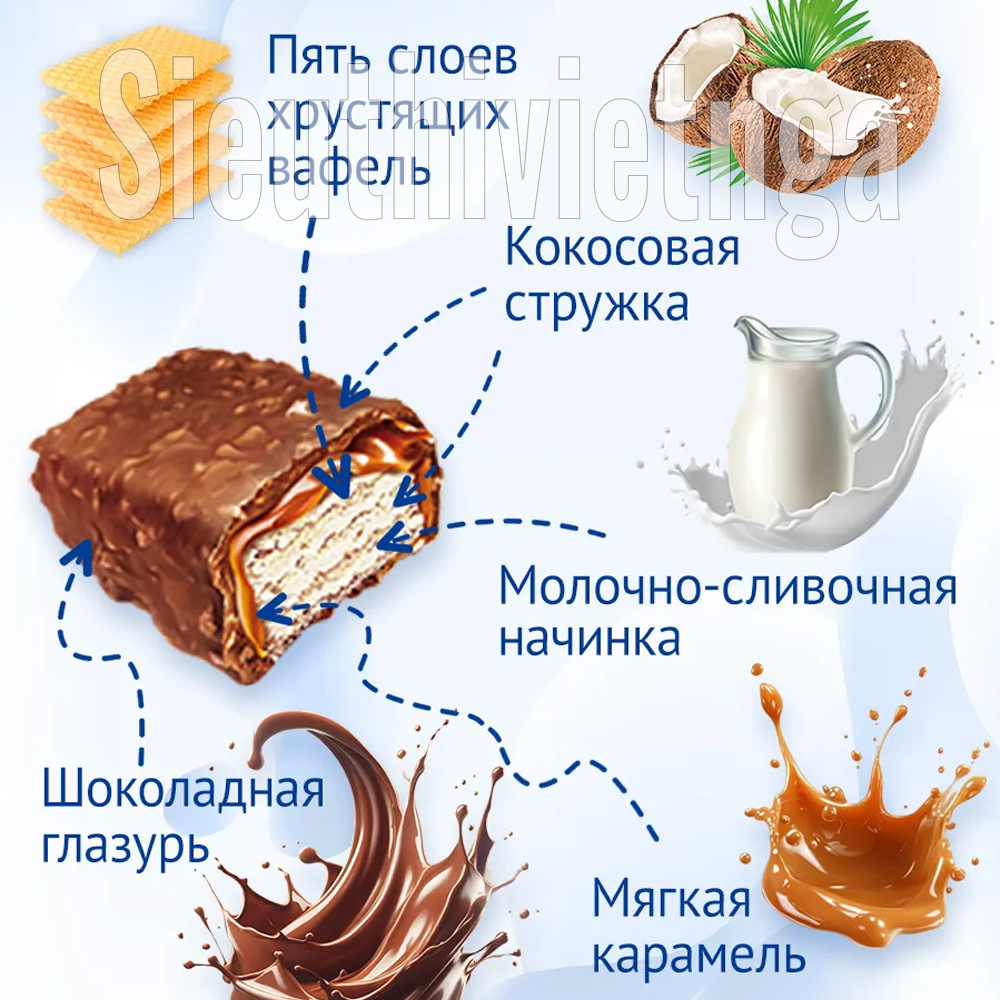 Thành phần: đường, bột mì, mật đường, dầu thực vật (cọ, hướng dương, đậu nành), vụn dừa, bột whey, chất thay thế bơ ca cao (dầu thực vật (cọ, hạt mỡ), chất nhũ hóa: lecithin đậu nành, chất chống oxy hóa: tocopherol, ca cao cô đặc), sữa bột tách béo, khối ca cao, bột ca cao kiềm hóa, bột kem, muối, chất giữ ẩm: siro sorbitol, chất nhũ hóa (lecithin, E476), hương liệu, bột nở: natri bicarbonat, chất điều chỉnh độ axit: axit lactic, chất chống oxy hóa (ascorbyl palmitate, tocopherol, ca cao cô đặc).